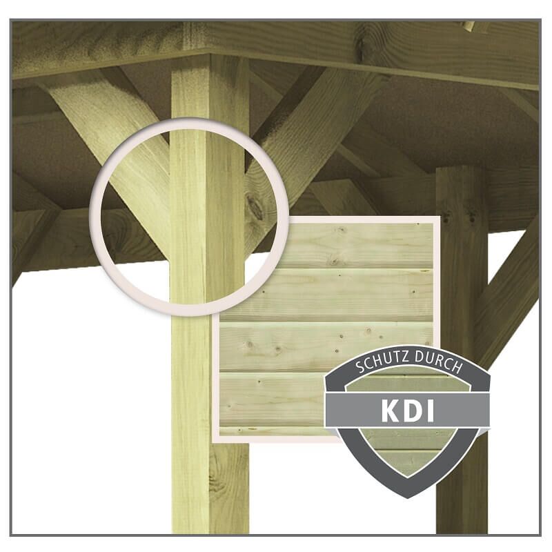 Unsere Pavillons bestehen größtenteils aus kesseldruckimprägnierten nordischen Hölzern. Während der gesamten Wachstumsperiode nimmt das Holz CO2 aus der Atmosphäre auf und speichert es dauerhaft. Dazu sind die kurzen Transportwege umweltschonend und kostensparend. Die langsam wachsenden Hölzer sind von Natur aus sehr robust und durch die schützende Imprägnierung bestens auf Belastungen durch Wind und Wetter vorbereitet. Bei unseren naturbelassenen Pavillons kaannst Du mit einem neuen Schutzanstrich jederzeit die Farbe und damit die Ausstrahlung Deines Pavillons verändern. Das sind echte Vorteile eines Holzpavillons. Bei Metall ist das aufwendiger und bei Kunststoffen nahezu unmöglich.