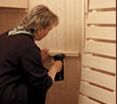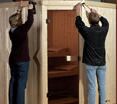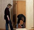 Damit die Wärme beim Saunieren nicht entweichen kann wird nun die Tür eingesetzt und am Rahmen verschraubt.
